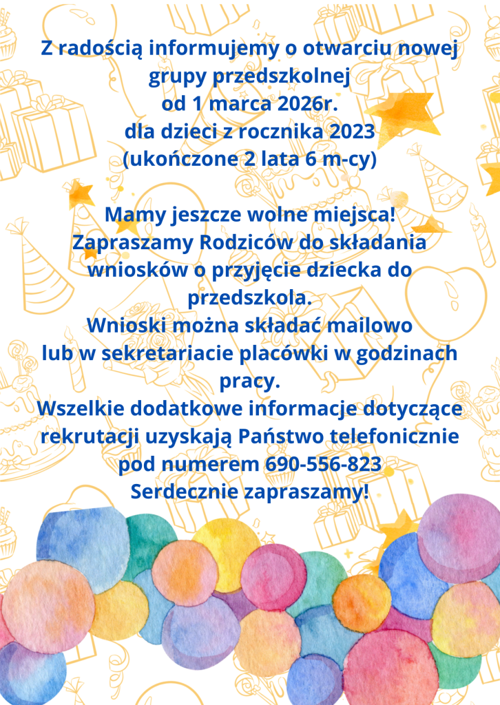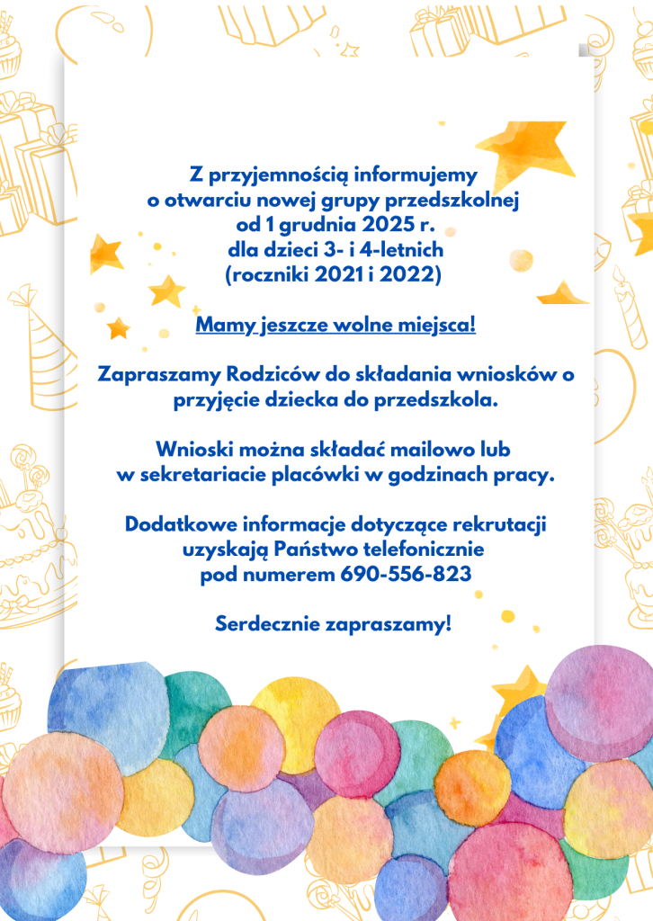 Z przyjemnością informujemy o otwarciu nowej grupy przedszkolnej dla dzieci 3- i 4-letnich (roczniki 2021 i 2022) od 1 grudnia 2025 r. Mamy jeszcze wolne miejsca! Zapraszamy Rodziców do składania wniosków o przyjęcie dziecka do przedszkola. Wnioski można składać mailowo lub w sekretariacie placówki w godzinach pracy. Wszelkie dodatkowe informacje dotyczące rekrutacji uzyskają Państwo telefonicznie […]